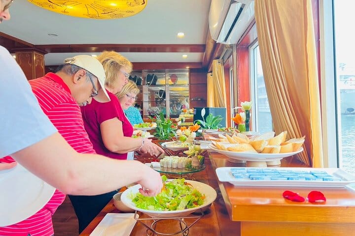 Halong Bay is a World Heritage site in Vietnam twice recognized by UNESCO – in 1994 and 1999. With almost 2000 islands rising from the emerald water of the Gulf of Tonkin, Ha Long is an excellent example of a Karst landscape created by a complex chain of millions of years of geological movement. A cruise trip with Crown Legend Cruise never gets bored with an exciting list of onboard and off-board activities in Halong Bay , where guests can immerse themselves in the less touristy area of the sea. Crown Legend Cruises brings an authentic Vietnam experience to intemational guests as they cruise in the signature destination of the country. An onboard cooking demonstration with Crown Legend’s talented Head Chef allows guests to lear interesting dining habit of local residents as well as have a quick taste of home-cooking dishes that have traveled a long way in Vietnam history.