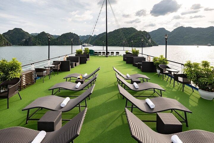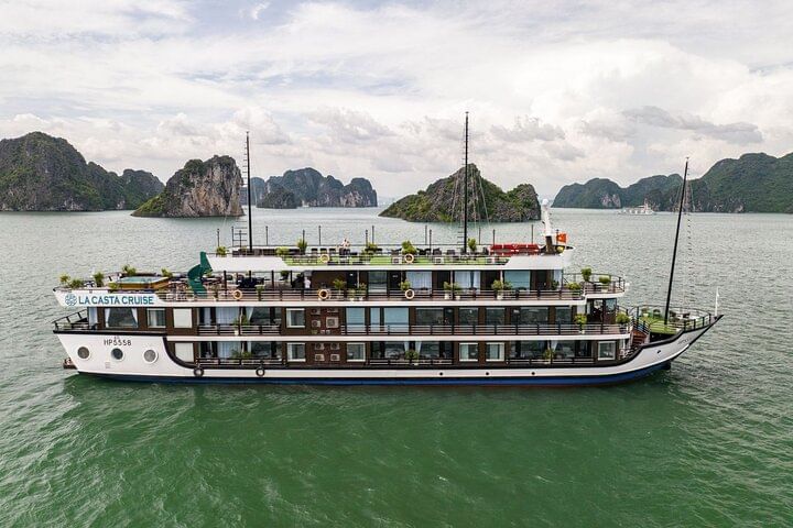LA CASTA CRUISE is the perfect cruise for combination of modern design with steel & nostalgic tradition with wooden interior. Beside the cruise offers luxurious rooms with private balconies. Especially outdoor mini swimming pool on the boat. It’s suitable for families with young children. Spend 2 days cruising around Halong Bay to Lan Ha Bay with highlights includes Ba Trai Dao (Three Peaches) Islets and Beach or Dark and Bright Cave or Tra Bau area of Lan Ha Bay. Overnight cruise around Halong Bay and Lan Ha Bay. Stay in luxury cabin with private balcony & bathtub shower. Activities can include kayaking, bamboo boat, cooking and tai chi. Explore spectacular scenery around Tonkin Bay including Halong Bay, Lan Ha Bay and surrounding areas.